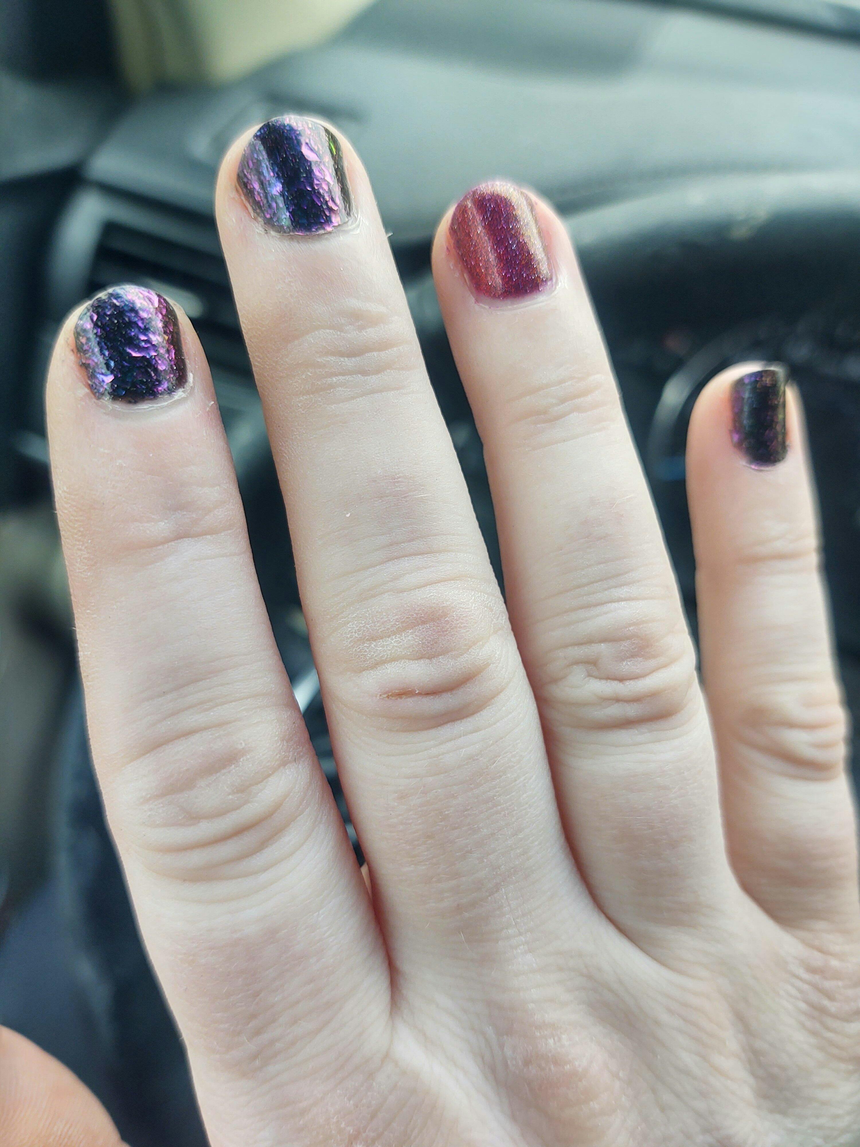 I do love the colors, I just wish the shimmers/glitters were a bit brighter/more bold. It's a very subtle pop from the dark base. I bet using a matte top coat would at least make it a bit more moody!