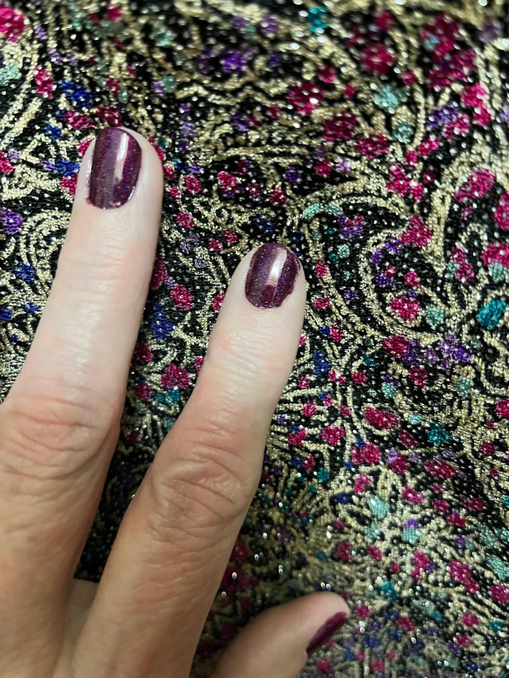 Ingredients: Butyl Acetate, Ethyl Acetate, Nitrocellulose, Acetyl Tributyl Citrate, Isobutyl Acetate, Isopropyl Alcohol, Adipic Acid / Neopentyl Glycol / Trimellitic Anhydride Copolymer, Silica, Styrene / Acrylates Copolymer, N-Butyl Alcohol, Benzophenone-1, D&C Violet #2, Aluminum Powder, Propylene Glycol, Magnesium Fluoride, Mica, Glitter