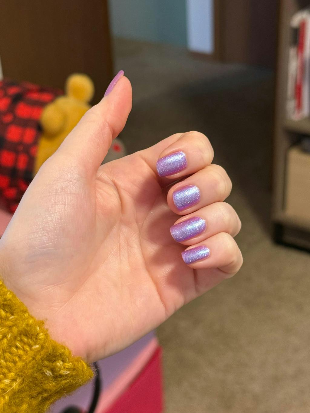 Ingredients: Butyl Acetate, Ethyl Acetate, Nitrocellulose, Acetyl Tributyl Citrate, Isobutyl Acetate, Isopropyl Alcohol, Adipic Acid / Neopentyl Glycol / Trimellitic Anhydride Copolymer, Silica, Styrene / Acrylates Copolymer, N-Butyl Alcohol, Benzophenone-1, D&C Violet #2, Aluminum Powder, Propylene Glycol, Magnesium Fluoride, Mica, Glitter