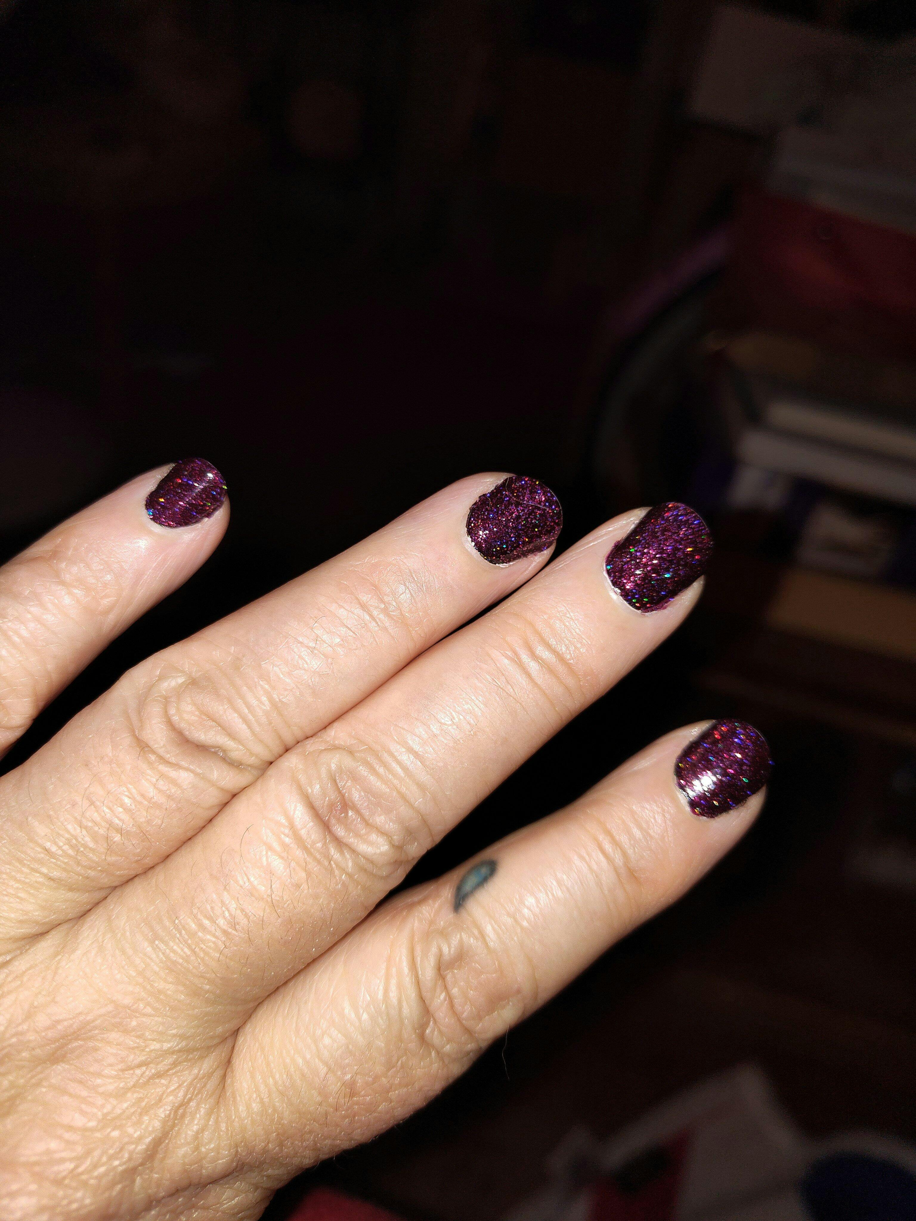 Ingredients: Butyl Acetate, Ethyl Acetate, Nitrocellulose, Acetyl Tributyl Citrate, Isobutyl Acetate, Isopropyl Alcohol, Adipic Acid / Neopentyl Glycol / Trimellitic Anhydride Copolymer, Silica, Styrene / Acrylates Copolymer, N-Butyl Alcohol, Benzophenone-1, D&C Violet #2, Aluminum Powder, Propylene Glycol, Magnesium Fluoride, Mica, Glitter