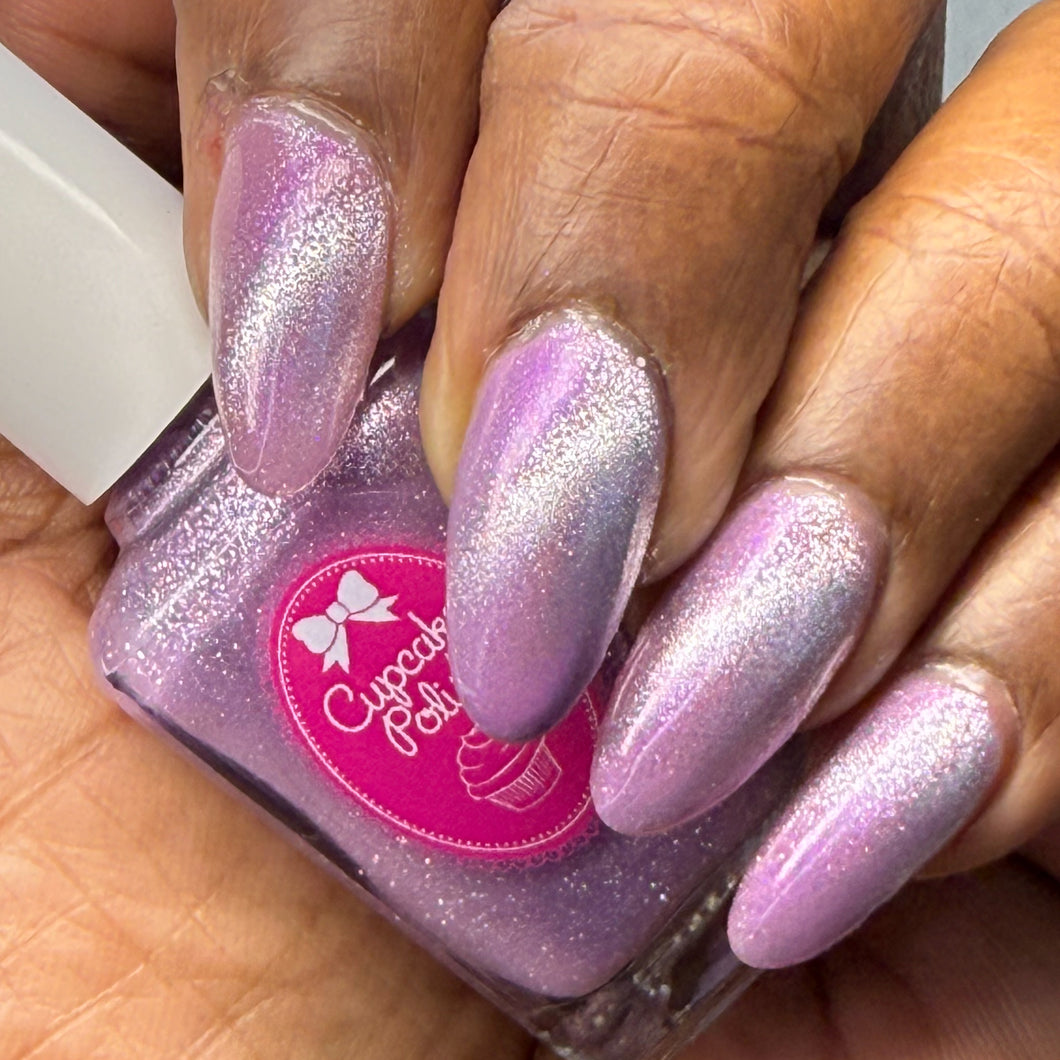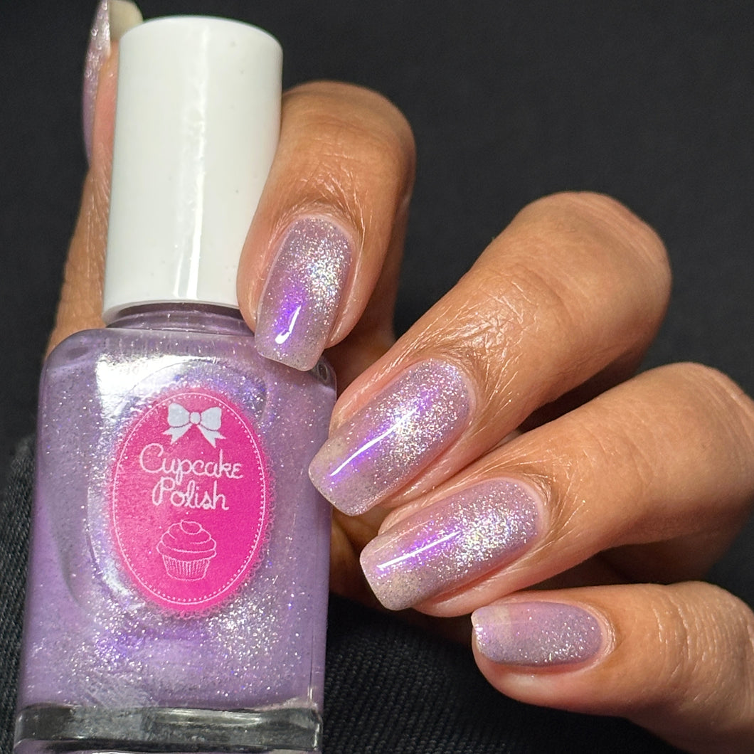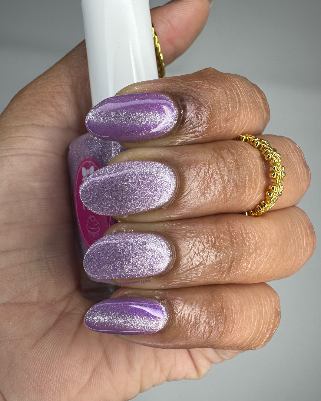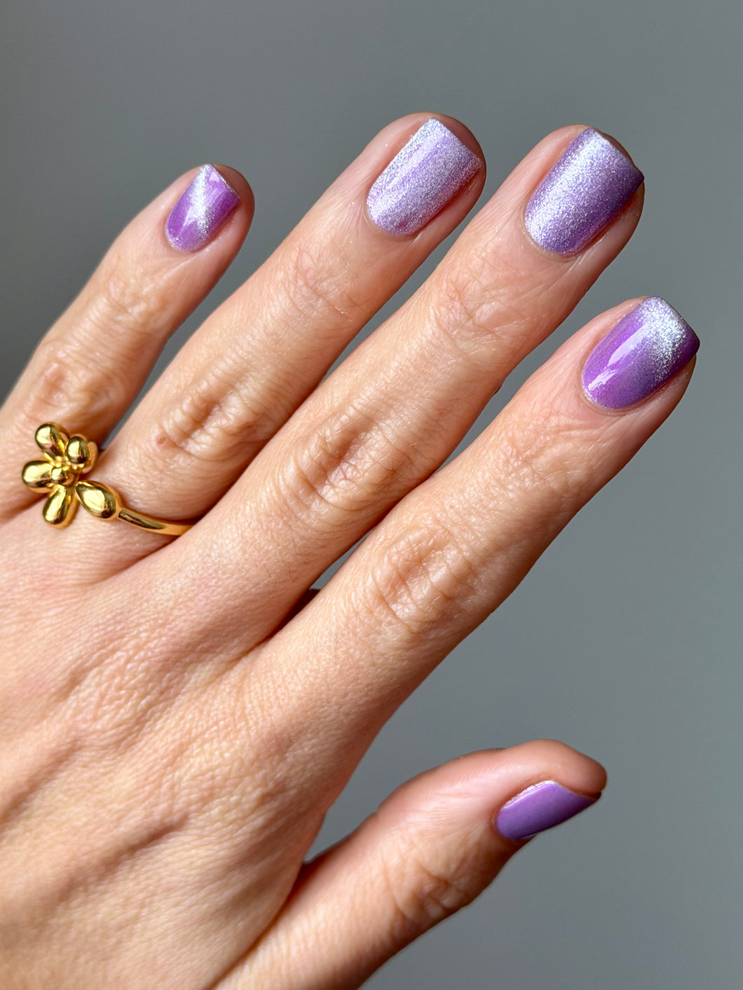 Moody winter magic meets soft pastels in Midnight Chalet. This pastel purple nail polish features glowing blue aurora shimmer and silver magnetic pigment for a cool, enchanting look inspired by alpine nights.
