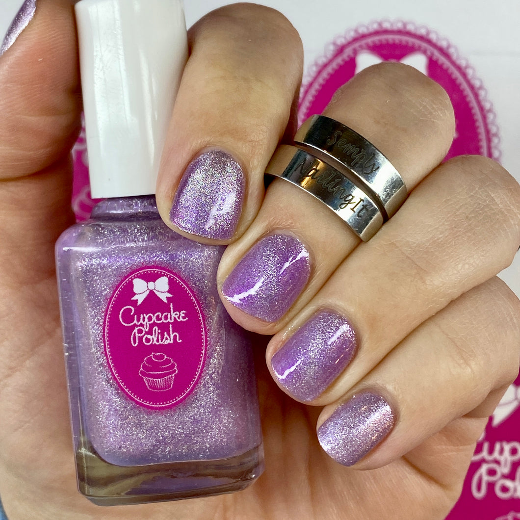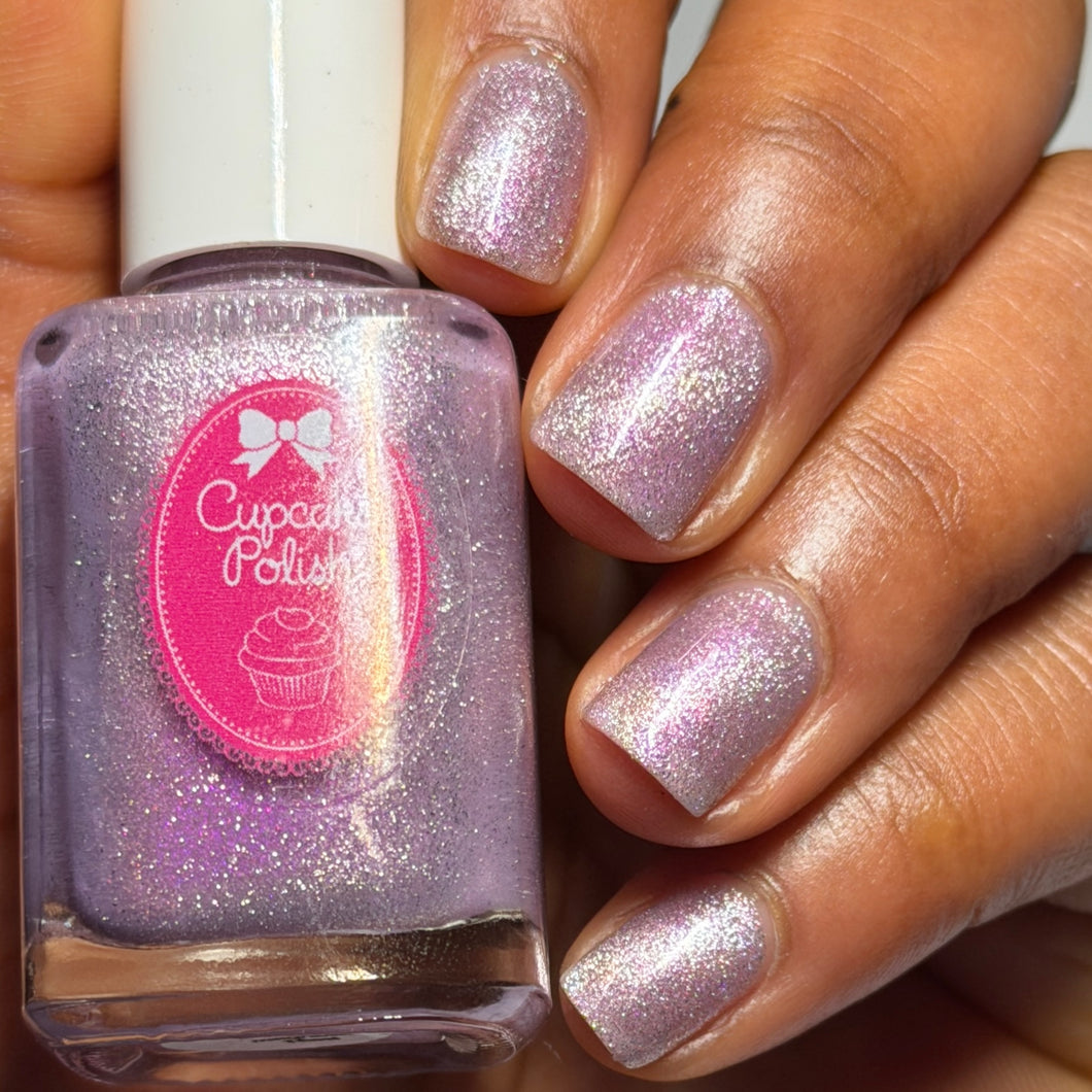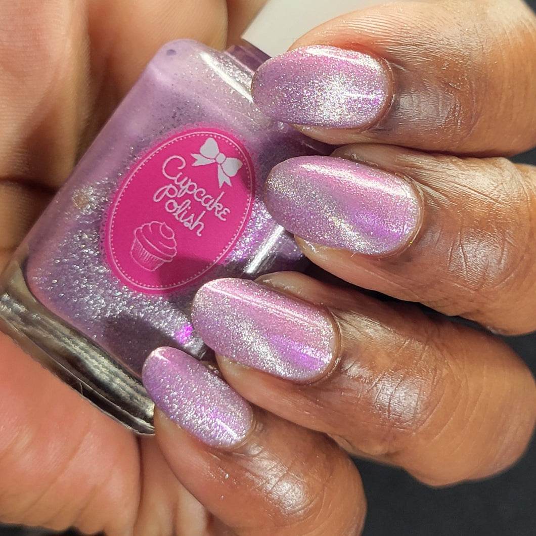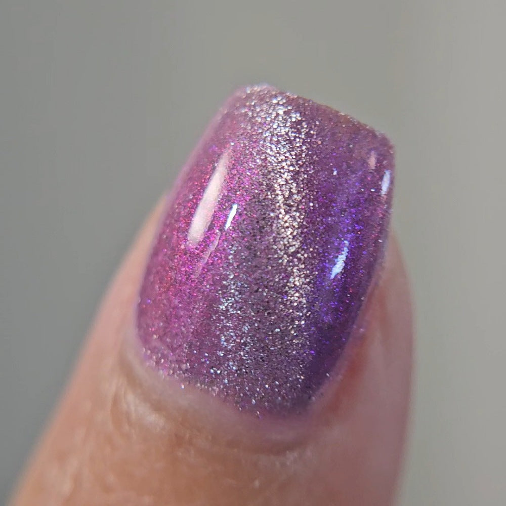 Moody winter magic meets soft pastels in Midnight Chalet. This pastel purple nail polish features glowing blue aurora shimmer and silver magnetic pigment for a cool, enchanting look inspired by alpine nights.