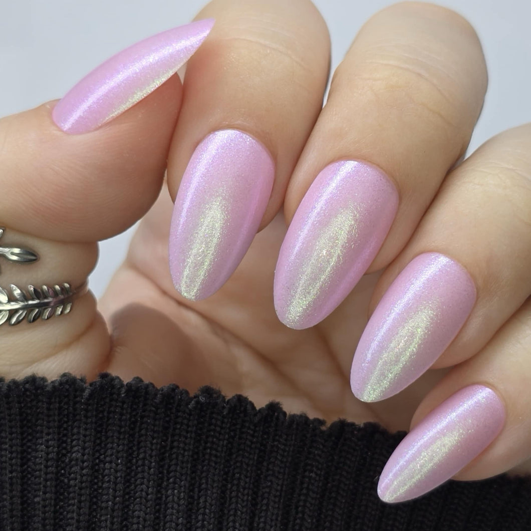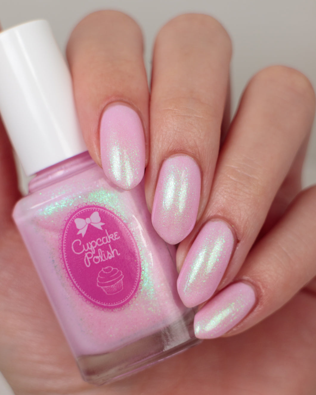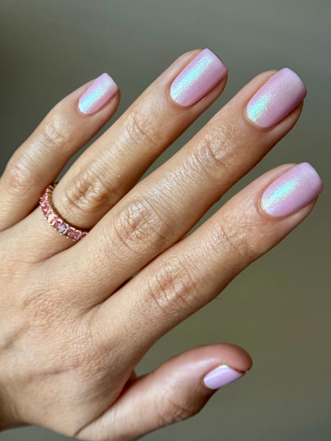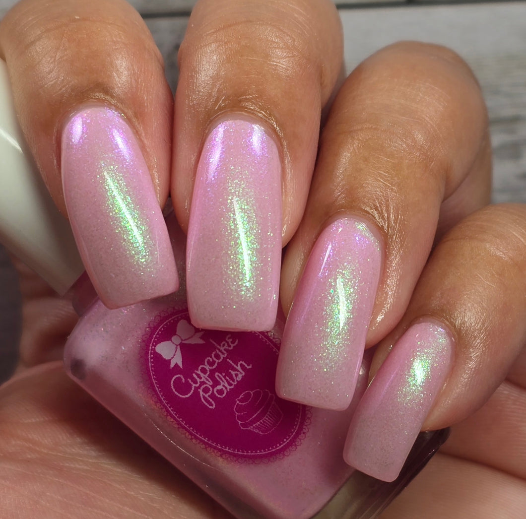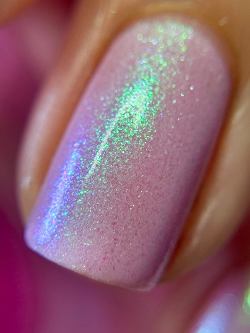 For Good – a pastel pink crème nail polish filled with green/pink/blue iridescent aurora shimmer.