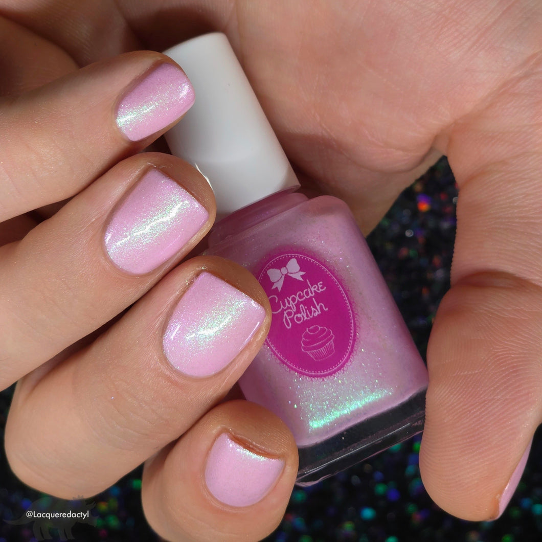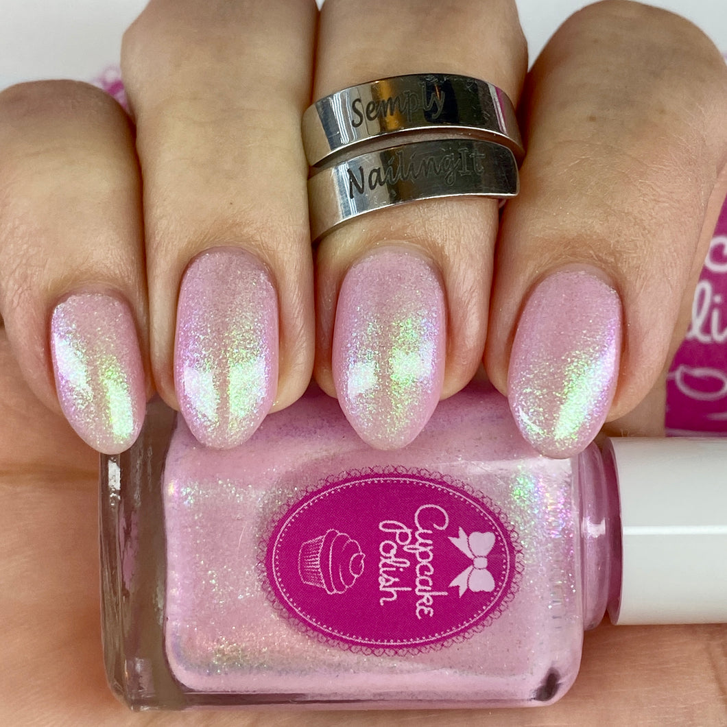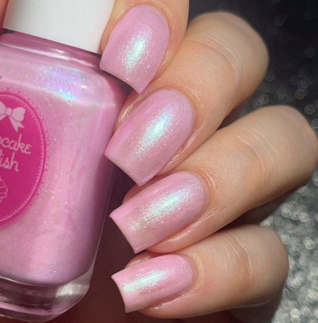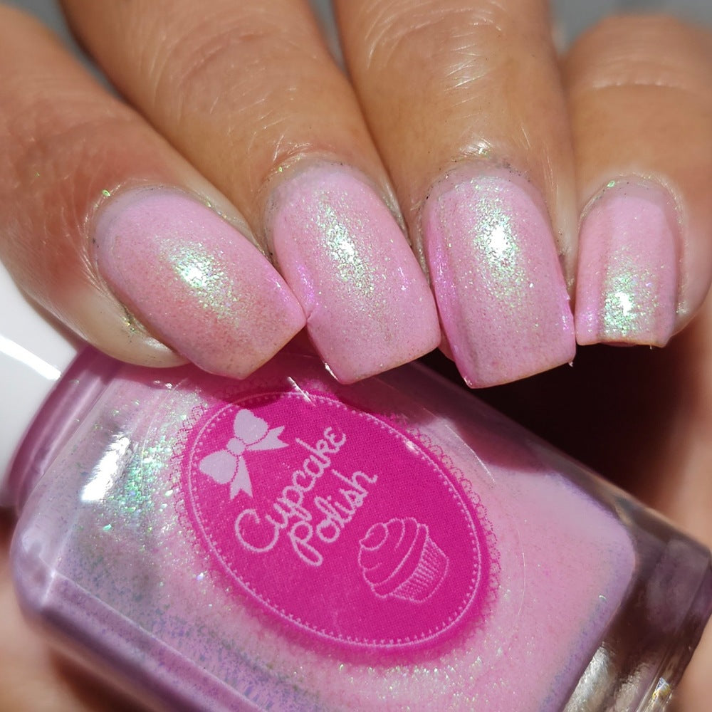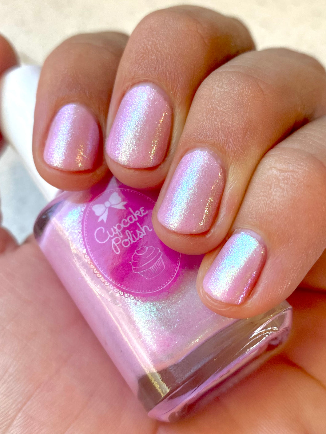 For Good – a pastel pink crème nail polish filled with green/pink/blue iridescent aurora shimmer.